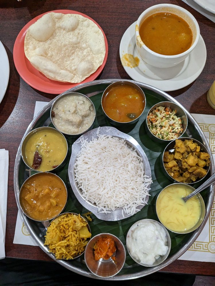 Served with 2 curries, sambar, yogurt, pickle, rasam, rice, dessert and roti.
